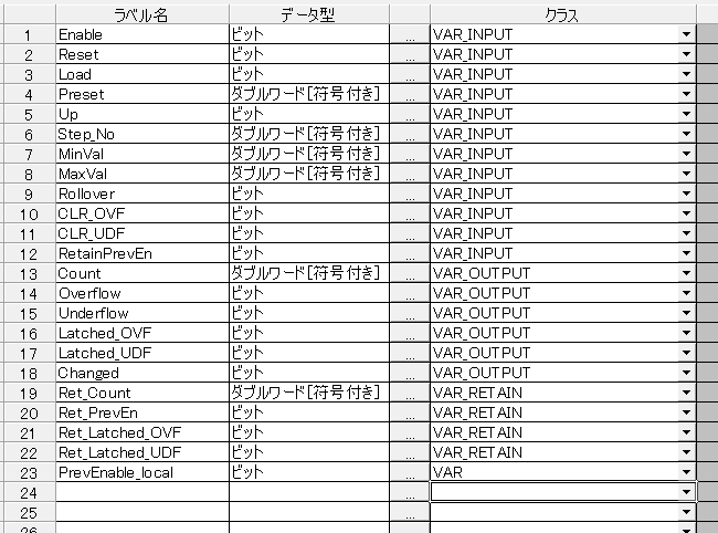 Enable : BOOL; // カウント命令(立ち上がりで1回カウント)