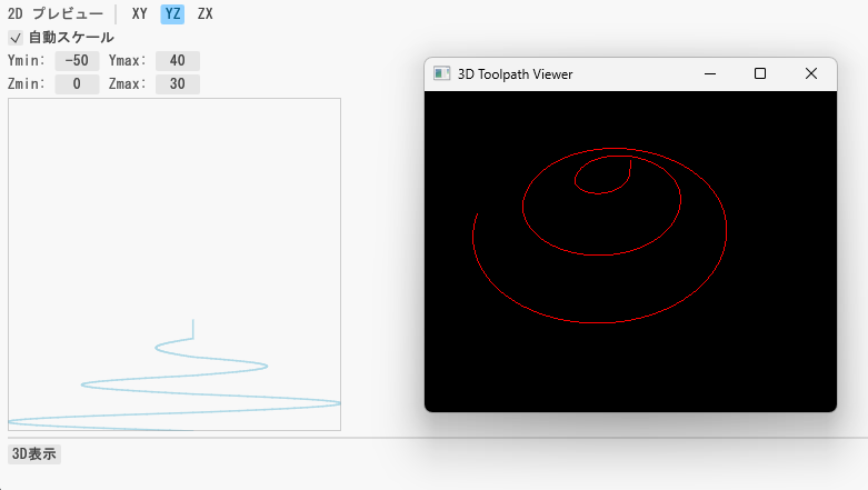 平面の3面方向と3D表示を行う、絶対座標の現在値を表示する